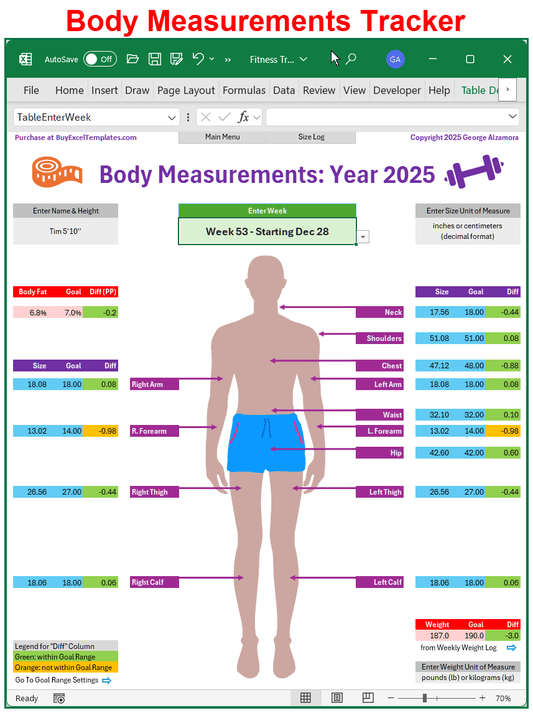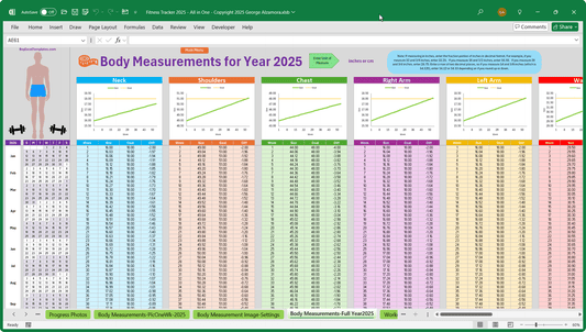 Body Measurement Tracker Spreadsheet | Progress Photos | Chart & Track Weight Loss & Gain, Body Fat, Arms, Legs, Chest, Neck, & Waist Size