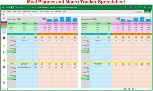 2025 Fitness App Spreadsheet, All-in-One Health & Fitness Tracker: Calories, Weight, Body Measurements, Water, Sleep, Exercise