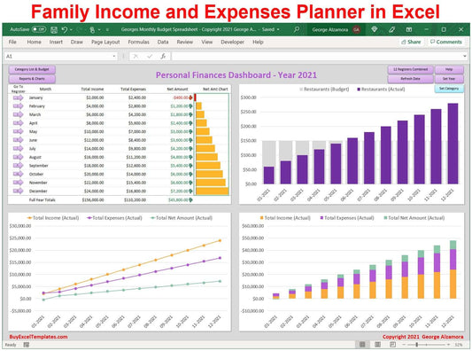 Family Budget Spreadsheet Planner, Personal Finances, Income & Expense Log