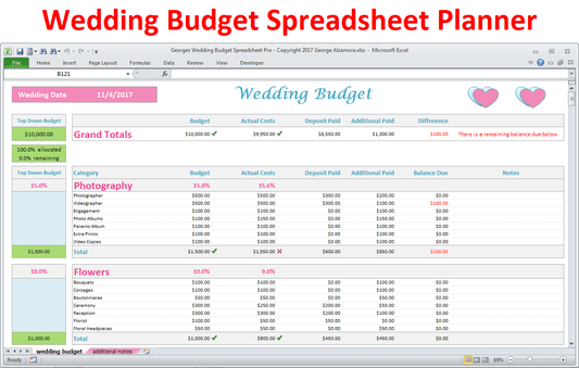 Planning a wedding on a budget with this financial wedding organizer can help you save money by keeping within the budgets that you set within the wedding budget spreadsheet. If you are getting married this wedding planner is a tool that can help whether you are a professional wedding planner or a DIY.